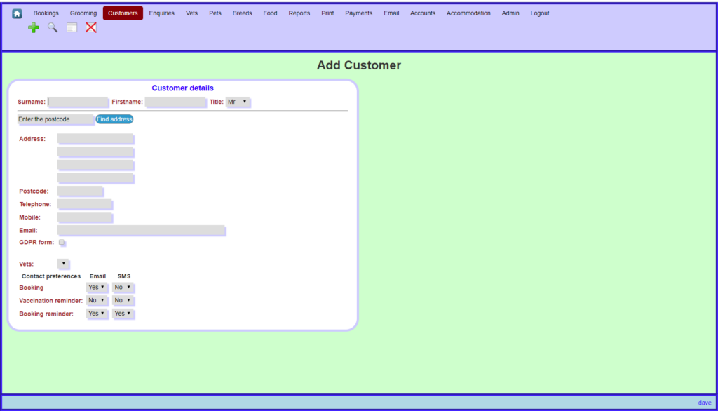 To add a customer complete the relevant fields. Once a field has been completed a save button will appear at the top right. The postcode lookup feature will not work unless the necessary information has been added in the admin area (see admin documentation). When all the information has been entered, press the save button and you will be taken to a screen to add a pet.